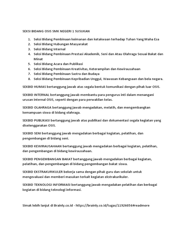 Mengembangkan wawasan dan keterampilan siswa di bidang sastra. Seksi Bidang Teknologi Informasi dan Komunikasi TIK Seksi Bidang Komunikasi Bahasa Inggris dan Bahasa Asing lainnya Sebenarnya kalau dijelaskan secara lengkap mungkin akan lebih panjang lagi jadi disini kami ringkas sesuai yang diperlukan saja dan. Semua seksi dalam pengurus OSIS memiliki tugas menyusun program kerja sesuai dengan bidangnya dan sudah diputuskan.
